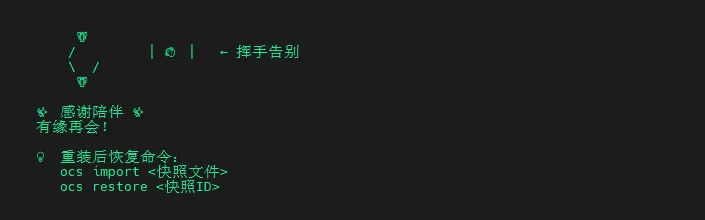 1. 备份优先:永远选择创建快照,即使你觉得不再需要 2. 存档多个位置:把 .tar.gz文件保存到云盘和本地3. 定期快照:即使不卸载,也可以用 ocs create定期备份4. 跨平台兼容:快照可以在不同操作系统间迁移