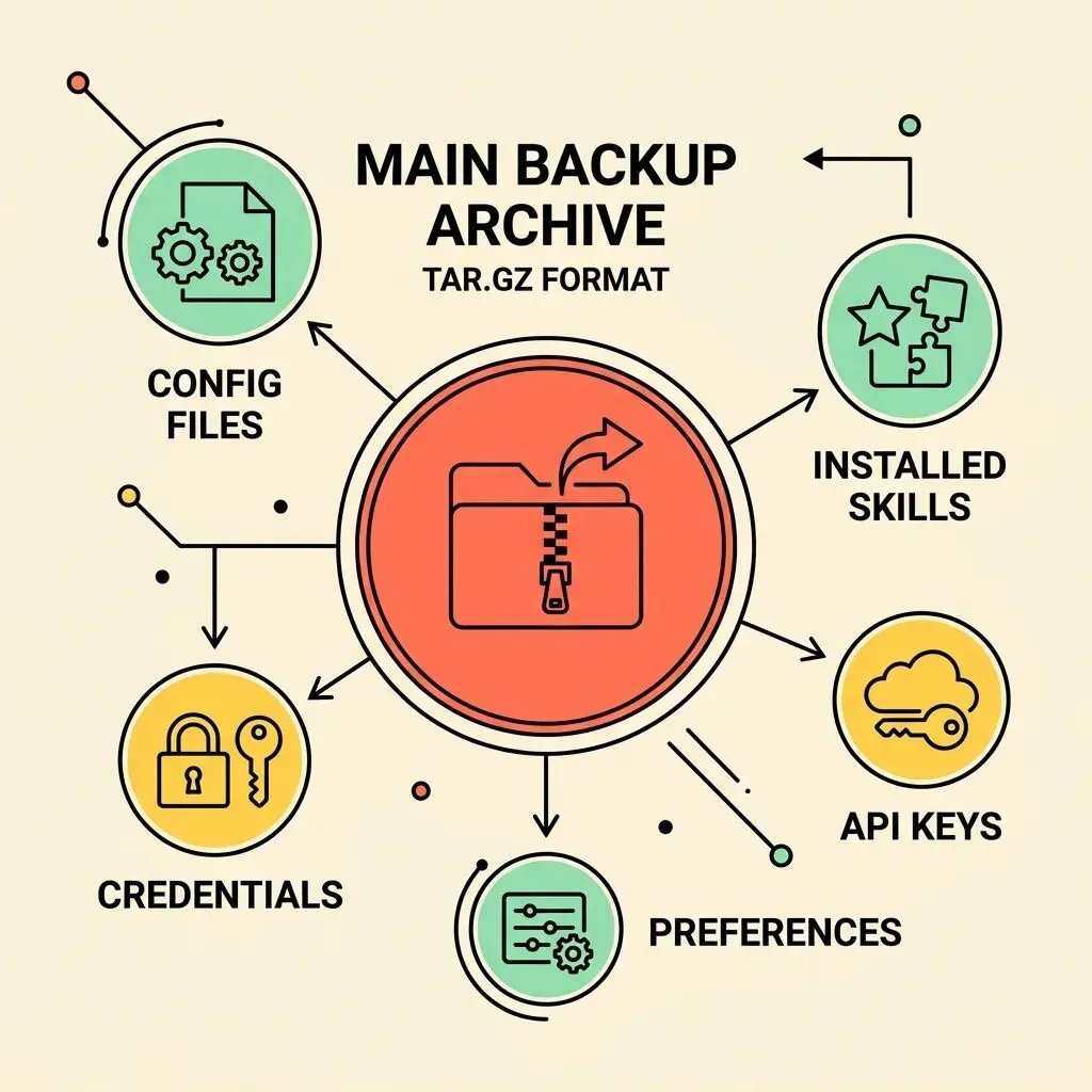 • ✅ 所有配置文件 • ✅ 身份凭证(加密存储) • ✅ 已安装的技能设置 • ✅ API 密钥配置 • ✅ 自定义偏好设置