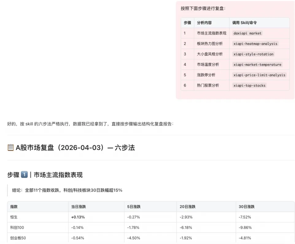 你会发现,当调用市场复盘skill的时候,实际就是通过上面6步的,每步都对应一个skill或者cli命令,而skill中对应的是cli的底层数据接口。这六步你可以自由组合也可以增加自己的方案,或者直接让OpenClaw大模型自由发挥。