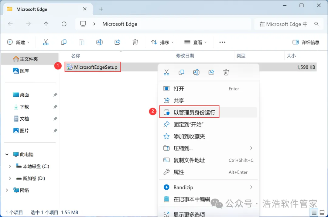 3、找到【Microsoft Edge】应用程序,右键选择【以管理员身份运行】它