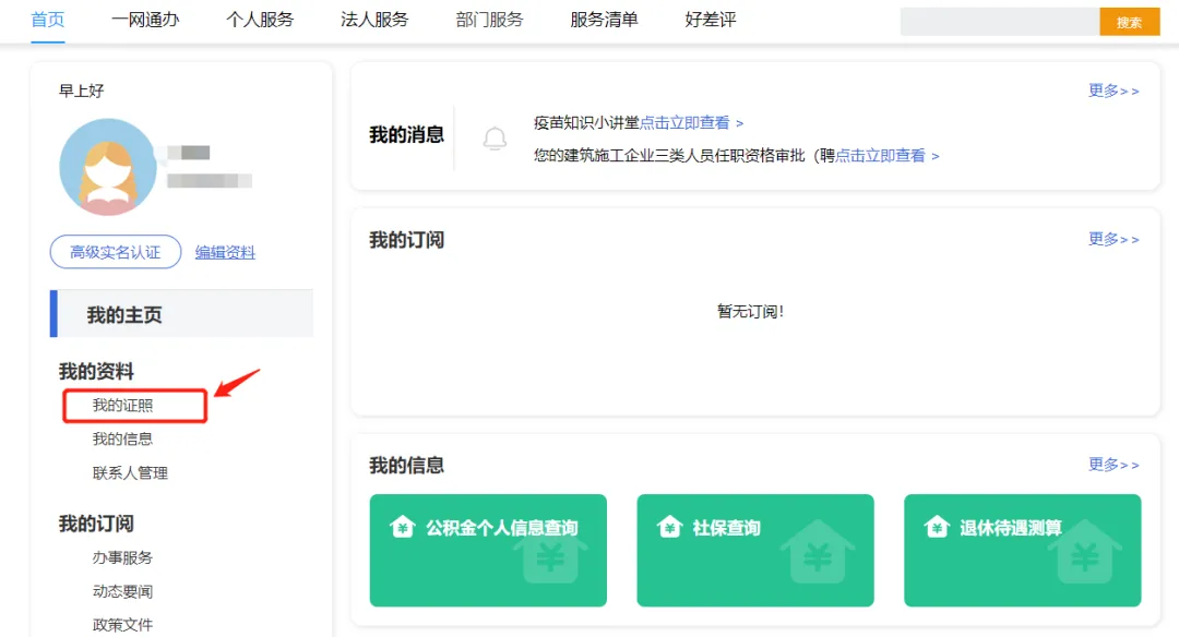 二、进入个人信息页面,点击【我的证照】