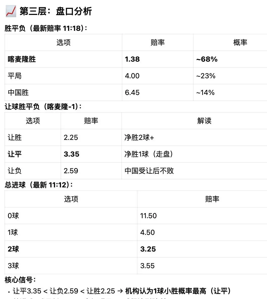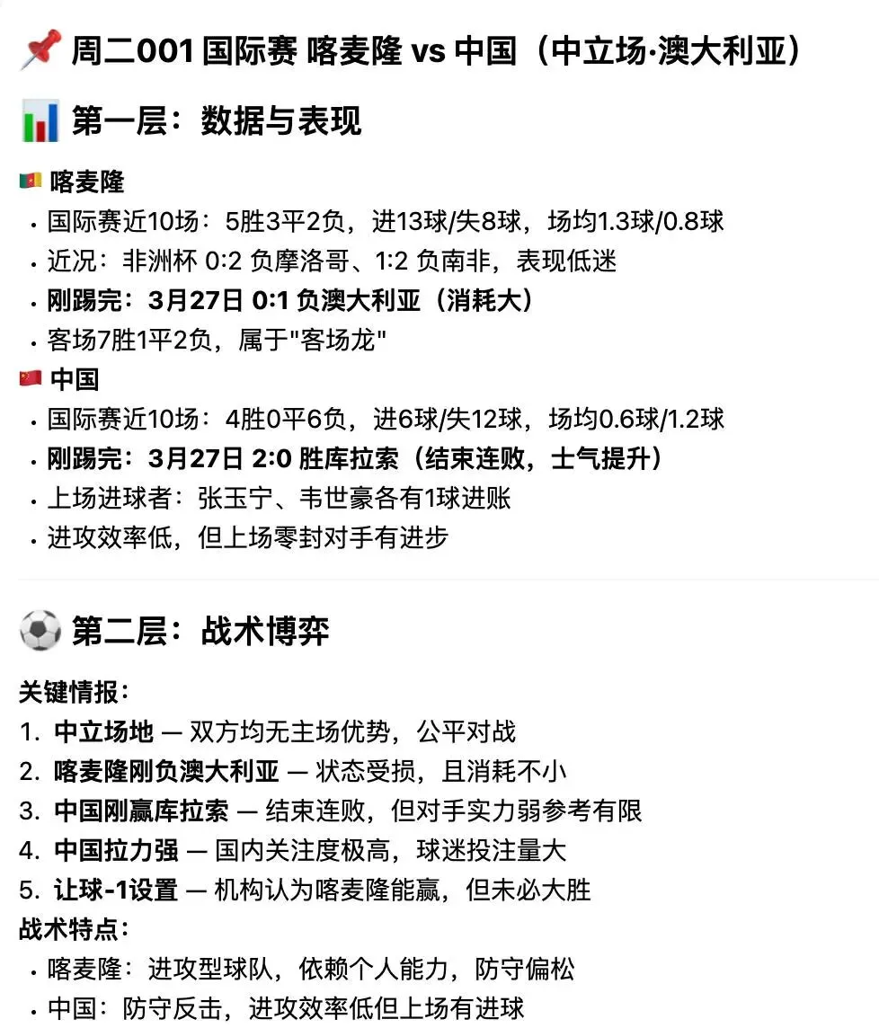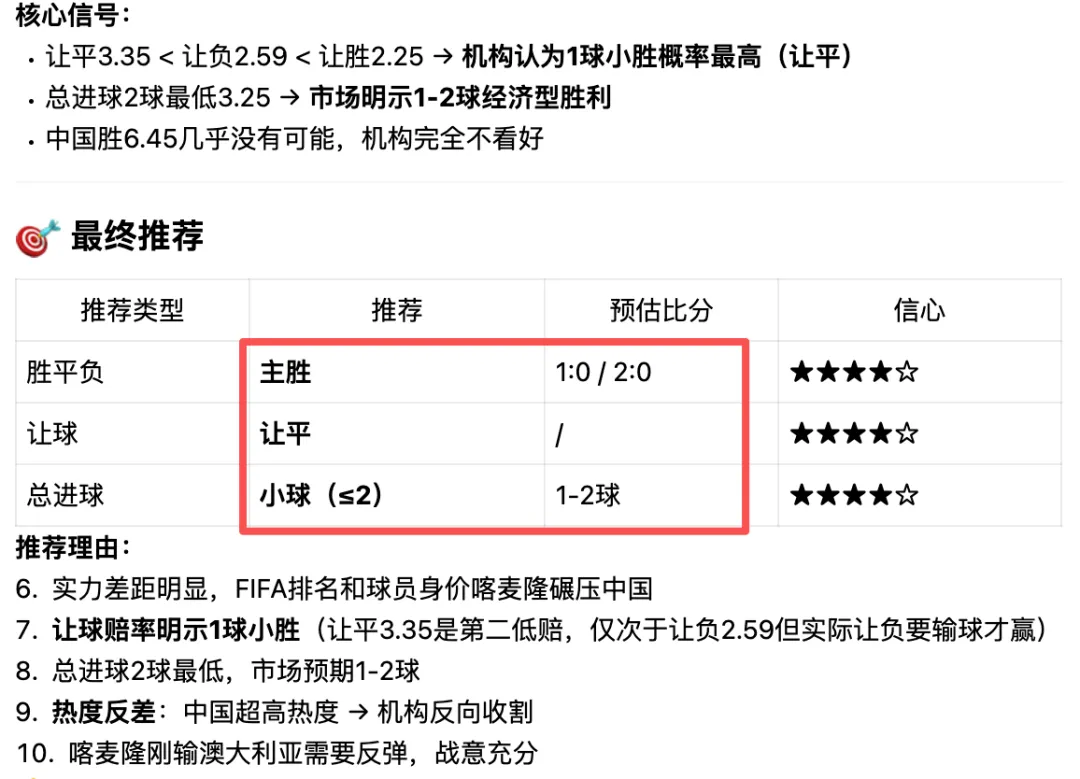 可以看看上周中国vs喀麦隆的比赛分析,整个过程,思路很清晰,逻辑一致!最终的结果完全正确!结果只是一个方面,但最重要的是:这套背靠顶级大模型,再加行业经验的openclaw足球龙虾,是AI时代下,强大的AI足球分析工具!作为足球迷的你,必须拥有!
