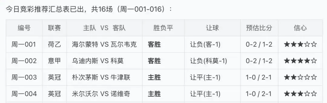 今日周一,有16场比赛,应兄弟的要求,我们免费分享4场,仅供参考。