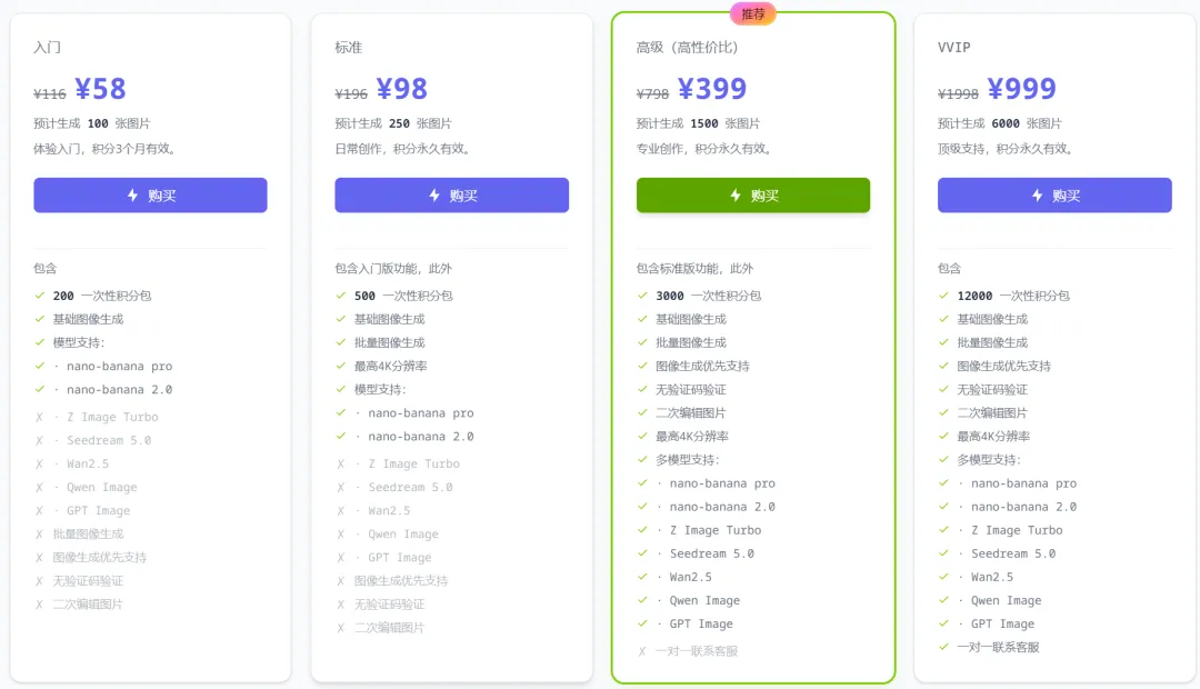 4. 成本合理控制:Nano Banana Pro按积分/按量计费,根据自己的需求选择套餐,日常创作用量完全够用,性价比很高。