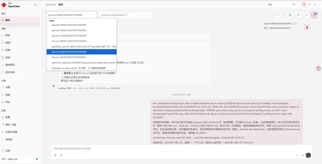 实战对照:打开 OpenClaw 控制面板的 Sessions 面板,你就能看到——不同频道的对话是分开显示的,各自独立排队。