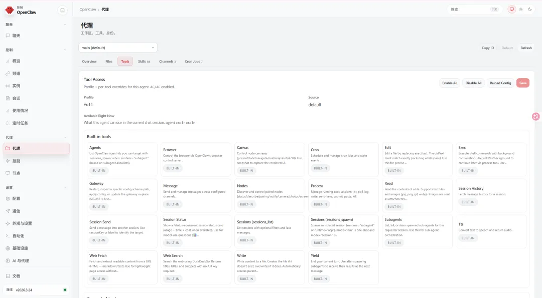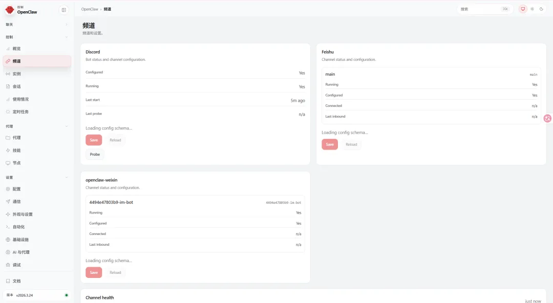 实战对照:打开 Channels 面板,可以看到小登同时接入了 3 个平台——Discord、飞书、微信。每个平台都有自己的 Adapter,但进来之后全是同一个格式。