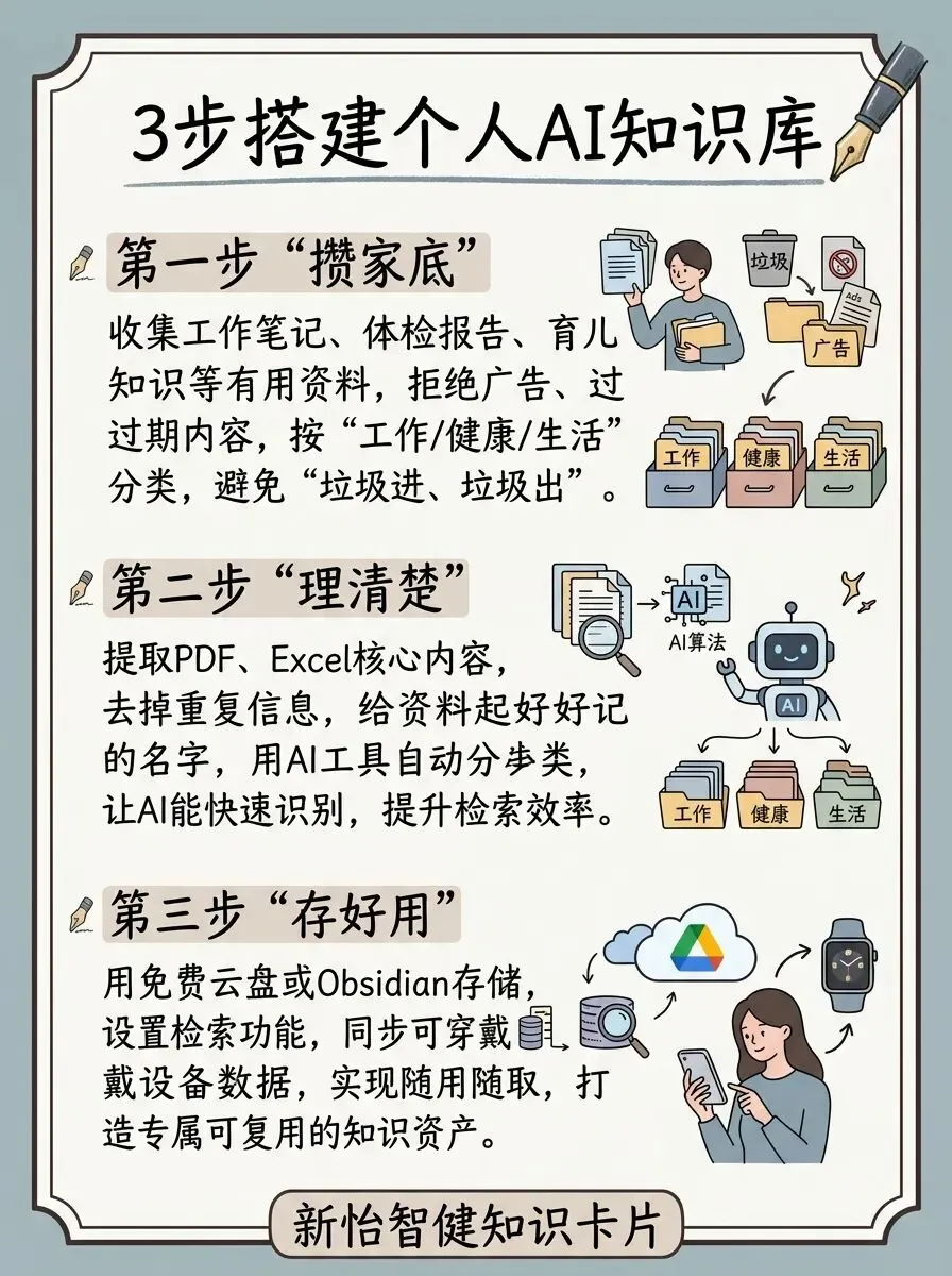 “攒家底”:收集工作笔记、体检报告、育儿知识等有用资料,拒绝广告、过期内容,按“工作/健康/生活”分类,避免“垃圾进、垃圾出”。 “理清楚”:提取PDF、Excel核心内容,去掉重复信息,给资料起好记的名字,用AI工具自动分类,让AI能快速识别,提升检索效率。 “存好用”:用免费云盘或Obsidian存储,设置检索功能,同步可穿戴设备数据,实现随用随取,打造专属可复用知识资产。