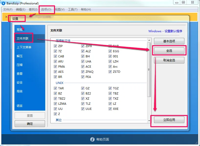 下载好整个文件解压出来,打开对应位置的EXE执行文件,再打开选项---设置---文件关联