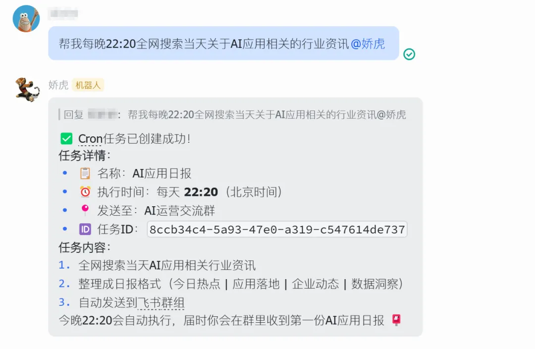 “帮我每天晚上22:20全网搜索当天关于 AI 应用相关的行业资讯。”