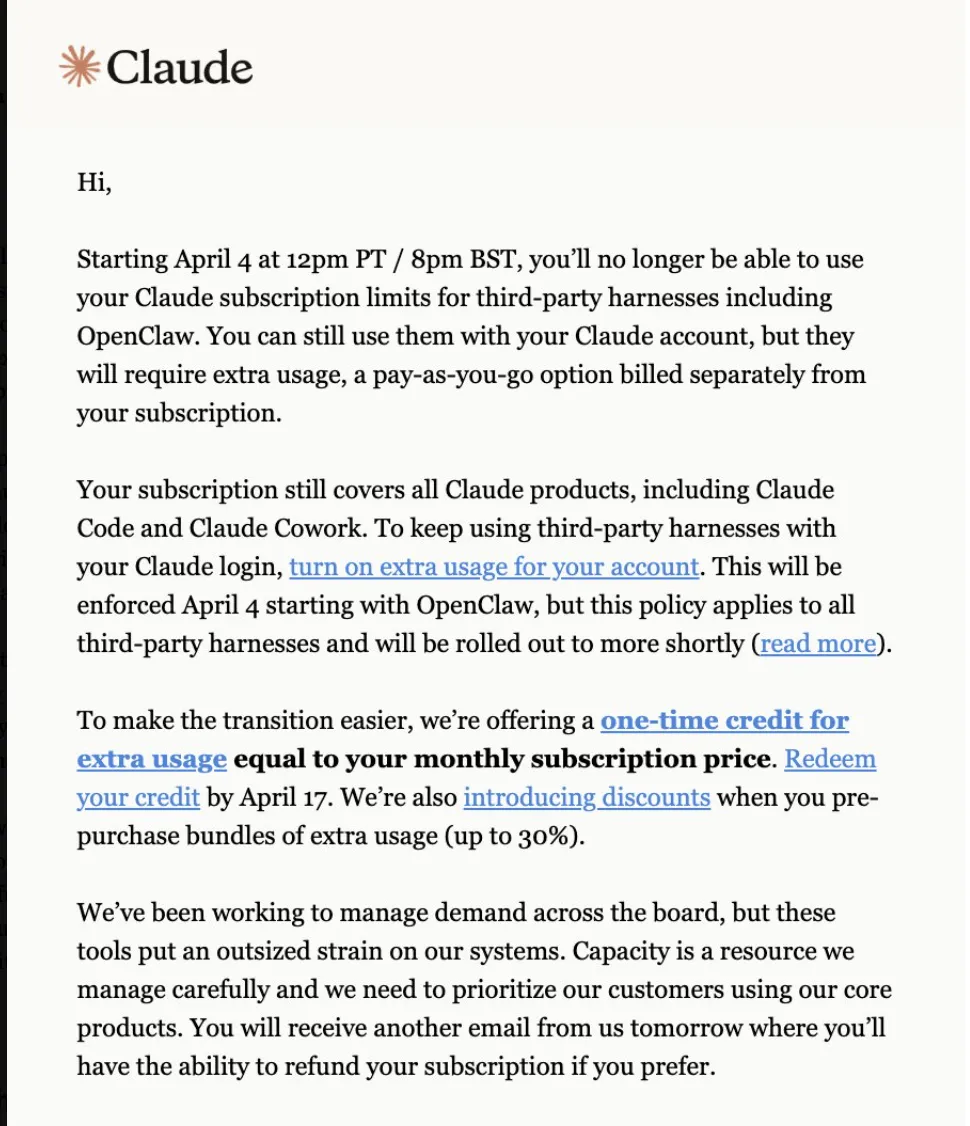 Anthropic那边怎么解释的呢?官方的说法是"第三方工具对系统造成了不成比例的压力,我们的订阅本来就不是为这种用法设计的。"