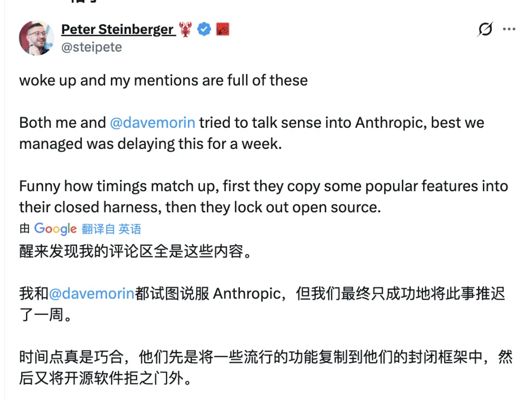 而最扎心的是OpenClaw创始人Peter Steinberger的原话,翻译过来就是"先把我们的功能抄进自家闭源工具,然后把开源锁死。"