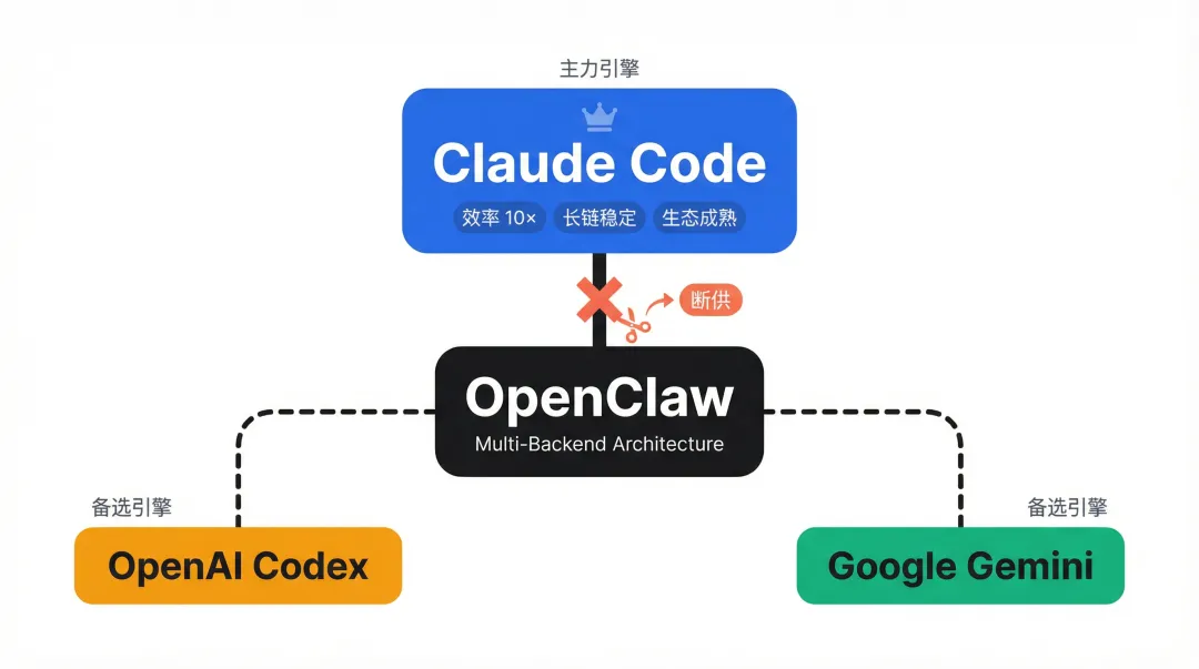 OpenClaw技术上支持Claude、Codex、Gemini三个AI引擎,但实际上绝大多数用户跑的都是Claude。原因有两个:
