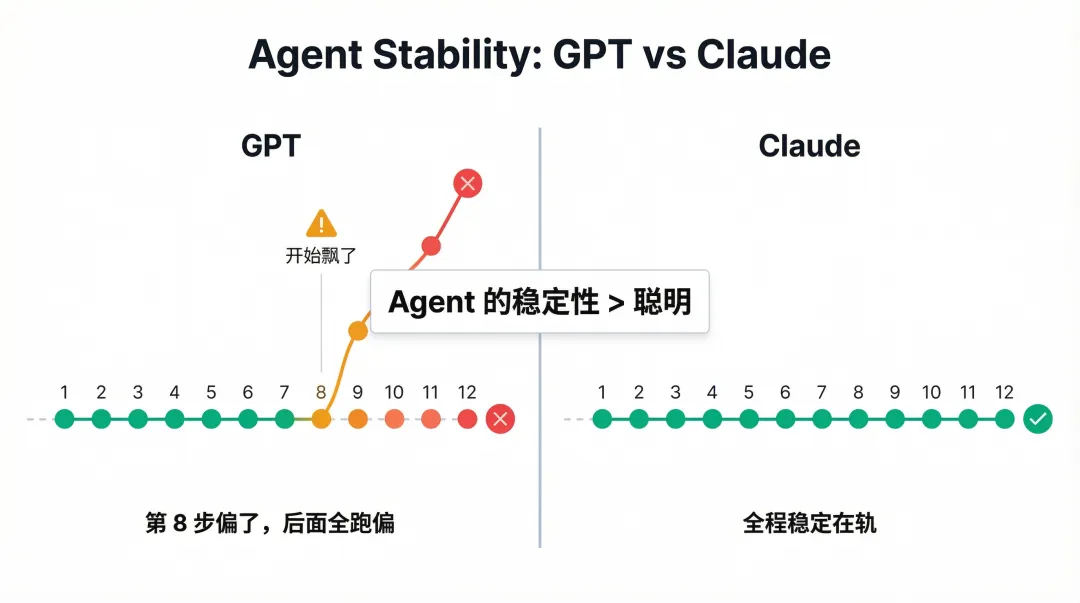 聊天的时候偶尔走神你可以手动掰回来,但一个自主运行的Agent,第8步偏了后面10步就全跑偏了。跑Agent这个事,稳定性比聪明更重要。