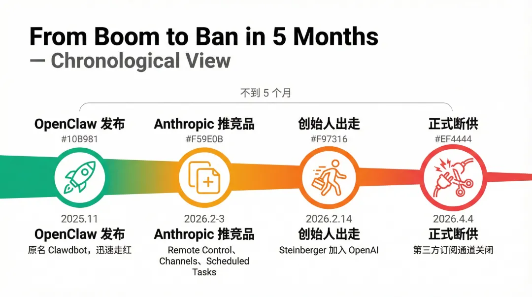 这套剧本大家都熟,Twitter对第三方客户端做过,Reddit对第三方App做过,苹果对无数开发者做过。只不过AI时代这个循环快得多——从OpenClaw爆红到被封,前后不到5个月。