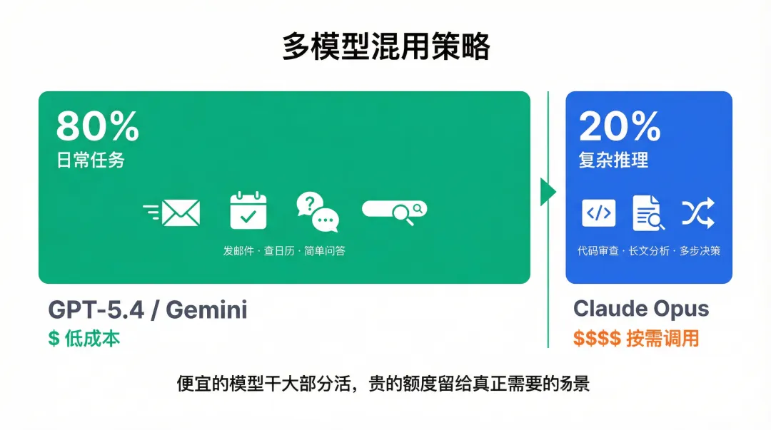 行者AI视频大佬的思路值得学——80%的日常任务用GPT-5.4或Gemini,发邮件、查日历、简单问答,用什么模型差别不大。只有代码审查、长文分析、多步骤决策这种复杂推理才调Claude Opus。