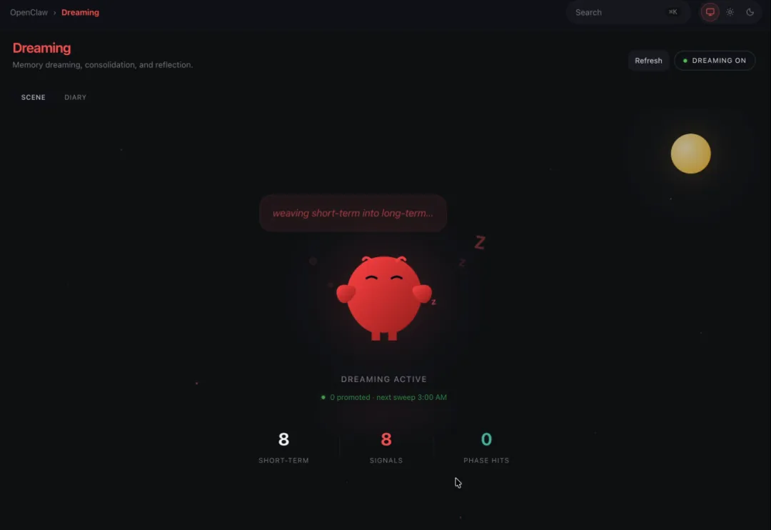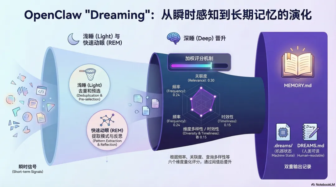 Dreaming 是 OpenClaw 一个实验性的、可选加入的记忆巩固系统,通过可解释的 Light、Deep 和 REM 阶段,把有意义的短期信号升华进持久记忆。