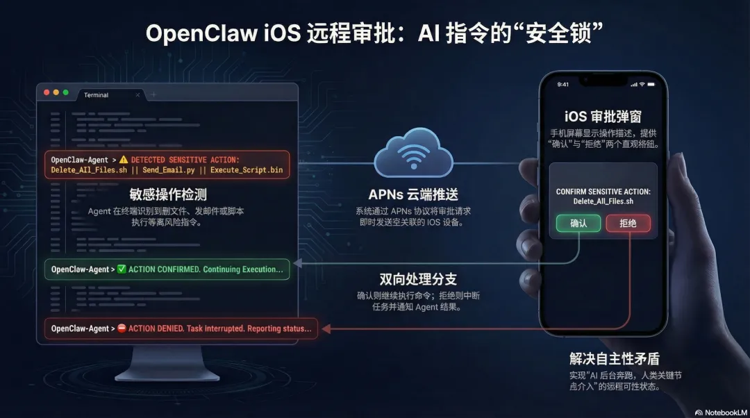 iOS 现在支持 APNs 推送审批通知。当 Agent 要执行一个敏感命令——比如删文件、发邮件、跑某段脚本——它会推一条通知到你手机,点开就是一个审批弹窗,确认或拒绝,不需要在电脑前盯着终端。