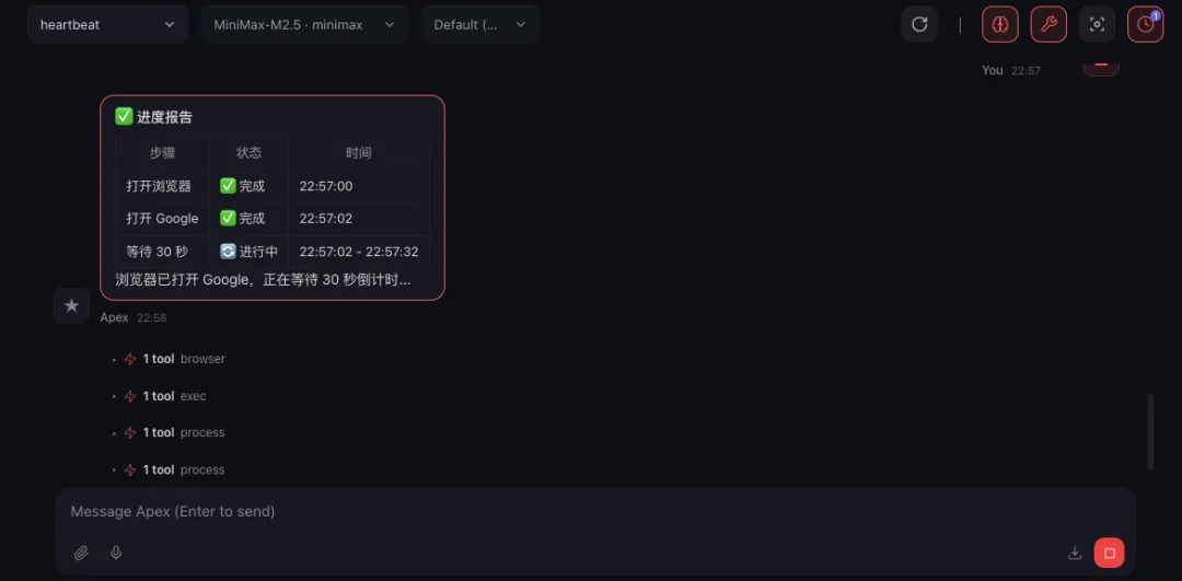 v2026.4.5 加入了实验性的结构化进度更新:Agent 在执行长任务时,会发出结构化的计划更新和执行步骤事件,支持的 UI 可以渲染出清晰的分步进度。