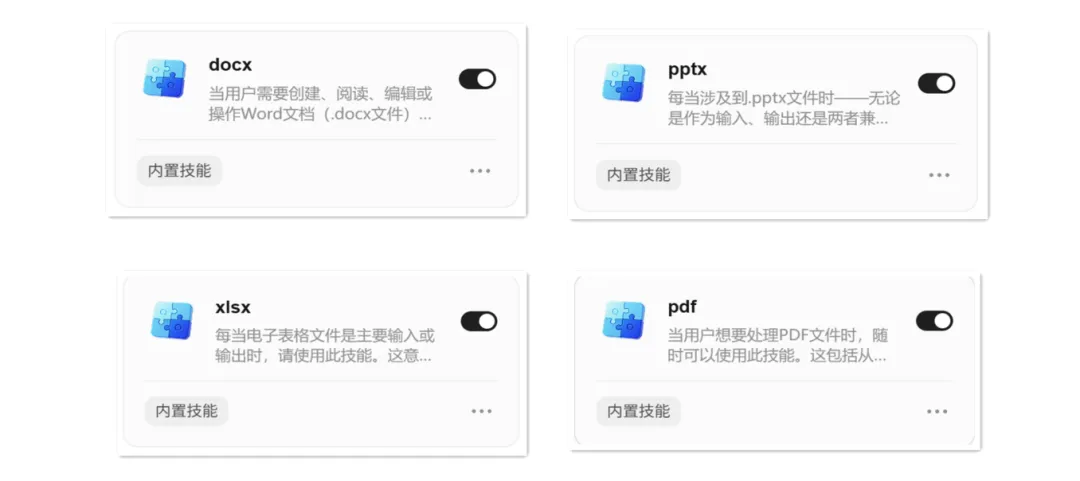 本文要分享的Office全家桶,是来自于QClaw内置的四大Skills,分别是docx、xlsx、pptx和pdf,这几个技能都是来源于QClaw官方内置技能,安全性有保障,同时这四大技能的组合,直接可以让你在QClaw中通过动嘴的方式,让QClaw帮你处理word文档、统计Excels报表、自动生成演示文稿等。