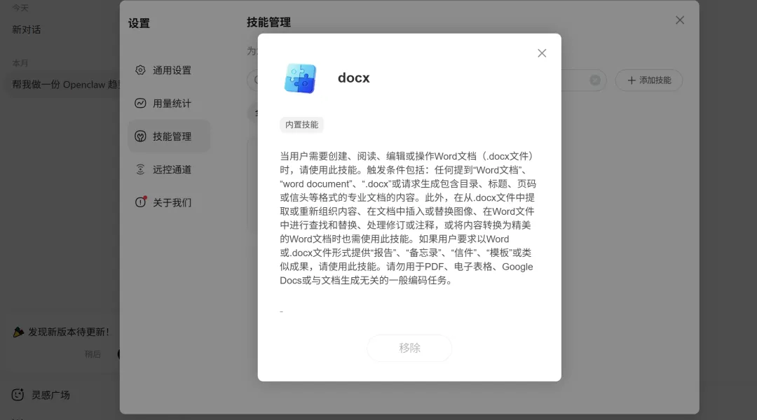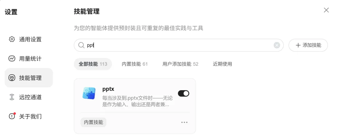 这些技能可以在对话框下方的技能,选择“技能管理”后便可以看到很多的内置的技能列表,在搜索框中输入上对应的Skill的名称,便可以找到对应的技能。