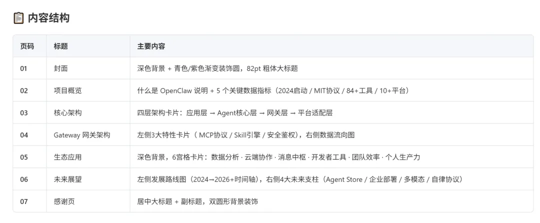 我的任务命令是这样的,“帮我制作一份OpenClaw趋势探查与前景发展报告的PPT”,经过一通思考之后,下面是它给我的PPT文稿生成的内容结构。
