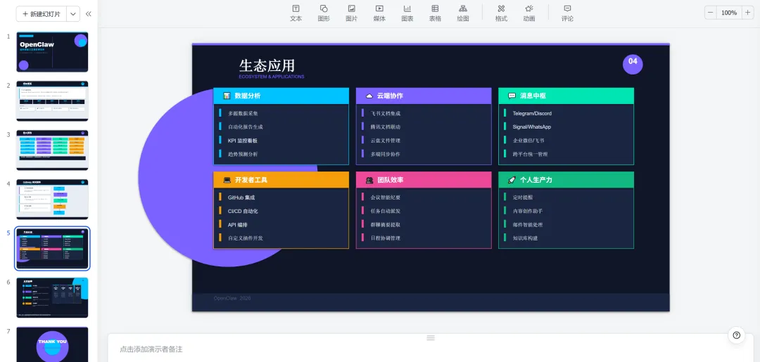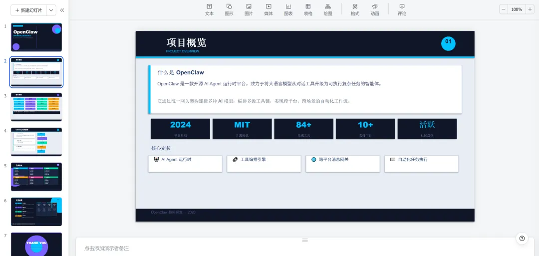 QClaw帮我生成的PPT里面包含了七大页,分别有封面、项目概览、核心架构、Gateway网关架构、生图应用、未来展望和感谢页。