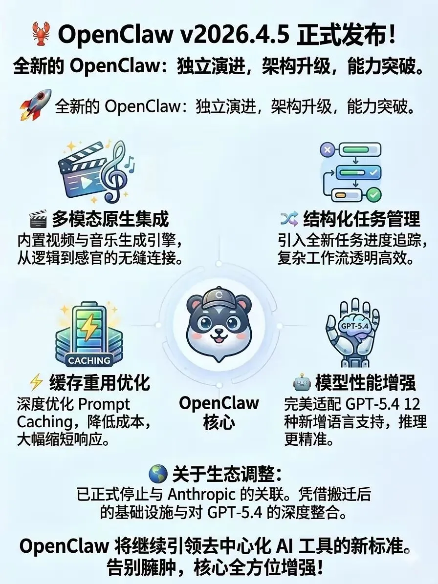 已正式停止与 Anthropic 的关联。凭借搬迁后的基础设施与对 GPT-5.4 的深度整合,OpenClaw 将继续引领去中心化 AI 工具的新标准。
