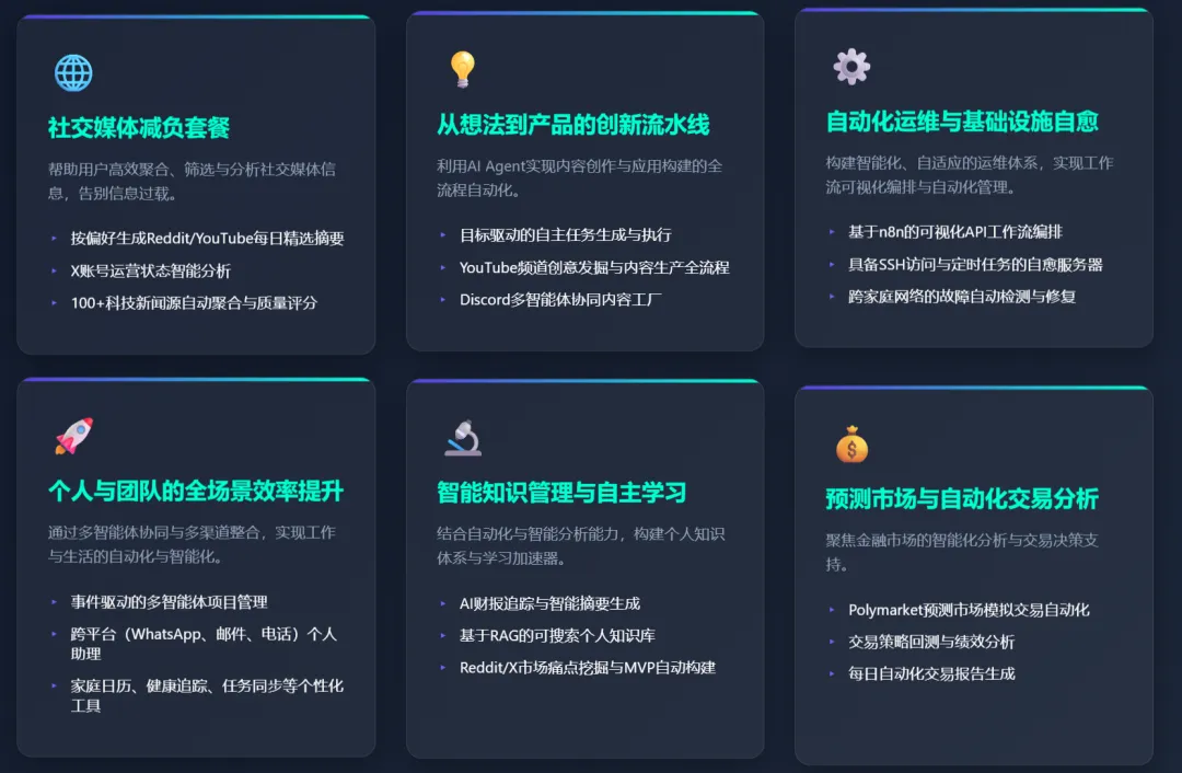 项目把OpenClaw的玩法拆解成六个你能立刻理解的场景:
