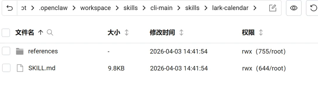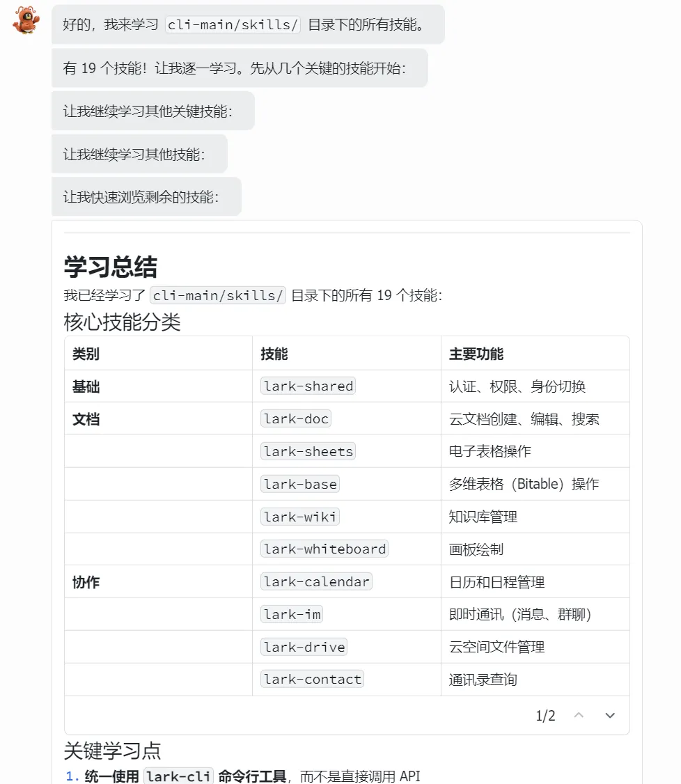 它马上去学习,知道了这是 cli-main 技能的结构,它使用 lark-cli 命令行工具来操作飞书日历。