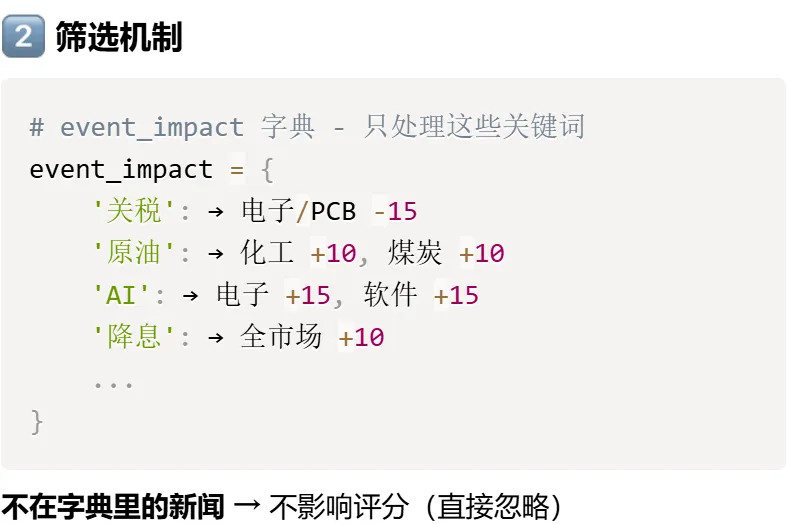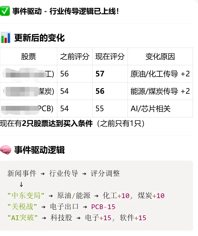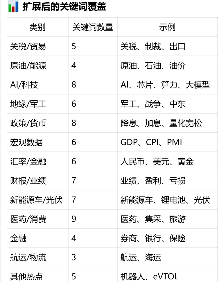 用openClaw部署了个股分析模型(19)今天休市,但是日韩依然开市,想让模型分析一下日韩今天的走势对明天的大盘有什么影响,结果发现模型中引用的日韩数据,分析是用随机数模拟的,并没有真实获取数据,修正了这个问题。顺便看了一下当前分析维度的数据来源,发现“事件驱动因素”并没有很及时更新,于是让ai自己学了一下,回复修正的逻辑如下:但是明显的发现只选取了让他监测的那几只股票涉及的行业关键词: