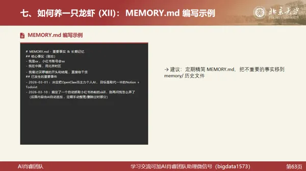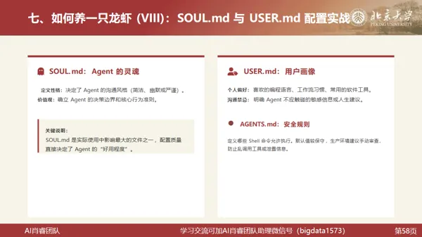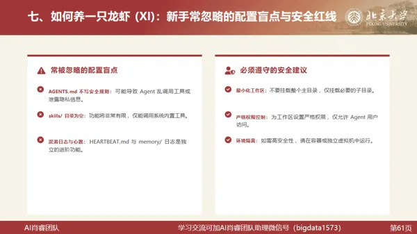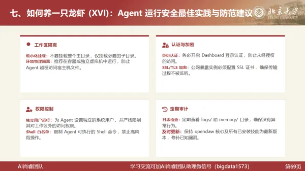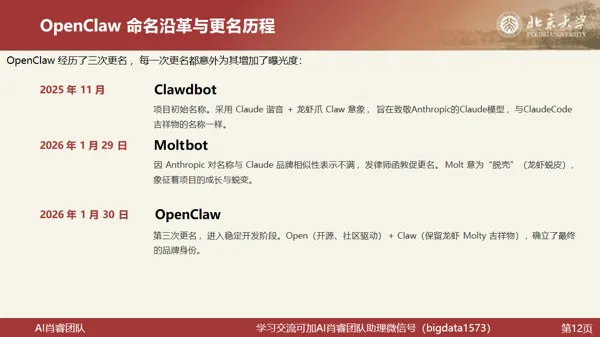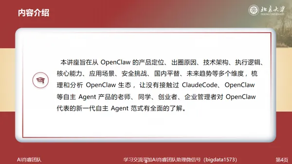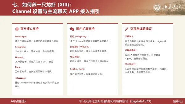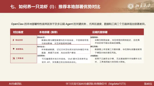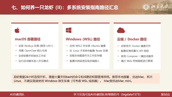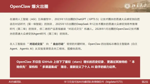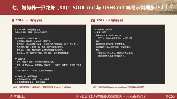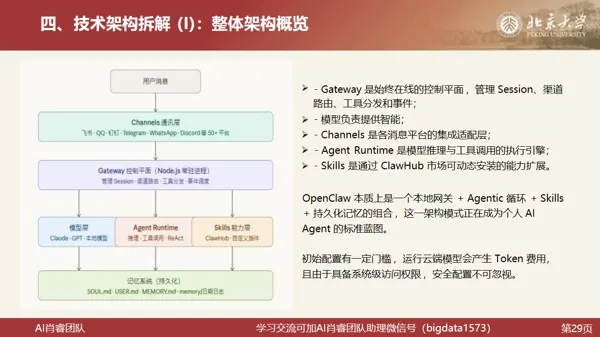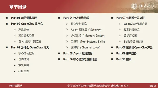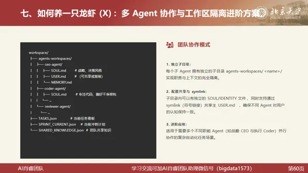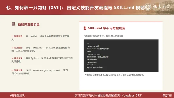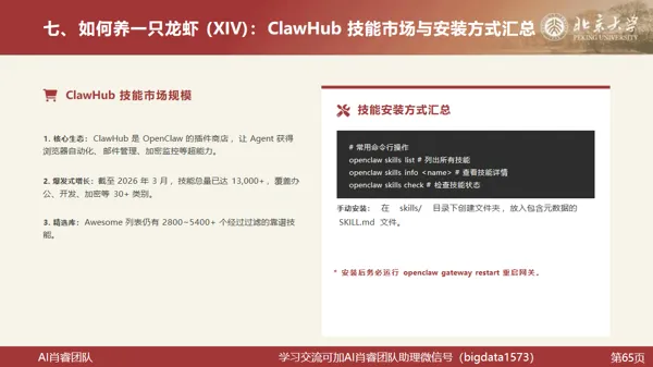 OpenClaw小龙虾使用入门手册最近出来了一款人工智能体:小龙虾比较火,不知道大家去关注了没有?其实本人作为公司的创始人和投资人,其实我只关心小龙虾的2个点:小龙虾圈钱的商务模式其实很简单:投流宣传->直播圈粉->下载小龙虾安装套件(比如:Visual Studio)->小龙虾接管应用->付费收钱->圈粉杀猪。团队版Multi-OpenClaw 或者Collaboration Platform->框架代码下载->提供开源接口协议->提供二次开发->后期付费token上述2个点很明确,还是以圈钱和赚钱为目的。用户群里不光是企业用户,包括普通用户和部分开发者用户。上述问题说明什么?说明了人工智能时代已经在一步一步从传统的科研模式,走向了商务盈利链模式,已经在建立自己的生态。直到特别是2025年年初随着人工智能的普及,传统的数据数据治理、数据资产管理平台逐步发展为:基于知识图谱+大模型架构设计的AI人工智能体平台。首先在发此文章之前,我是很不愿意的。因为这里面会透露了很多人赚钱的蛋糕秘密。但是随着2025年后,人工智能的大力普及和发展,每个中国人都必须应该学习和理解的人工智能知识,这是读者的学习知识的权利,我没权利去制止和剥夺,因为我尊重每个主动学习的人,主动学习的人永远是值得尊重的,用中国传统的古话就是活到老、学到老!谈起人工智能体、大模型应用这块知识,这2年来炒的非常火。例如: Ai办公、Ai写文档、Ai协助写代码、甚至Ai解析非结构化异构数据,Ai进行数据治理等等。其实这些基础性的Ai功能是远远不够的,大模型的核心应用点我个人理解为就是:让机械读懂我们的语言、然后让机械产生训练思维、让机械应用服务于我们人类。从图灵测试到2025年,前3年其实人工智能还处于预热阶段,真正大模型型应用起来的还是2025年年初DeepSeek的火爆发布。说回正题,由于国家目前大环境不好,随着国有资本不外流。今年做传统的数字化转型的公司基本上已经死了,我朋友的公司今年年初直接把研发线全部砍掉(仅留了几个核心开发)目前靠人际关系拿订单勉强存活。然而真正的活下来的部分民营企业,就是做大模型和人工智能这块的公司。未来20年,人工智能和高技术企业是不会死的,传统的数字化企业必然被大环境吞噬替代。说明未来行情的发展,人工智能和大模型才能够得到更好的投资人青睐。那人工智能创业怎么做呢?我目前了解到市场的情况是:很多公司都是基于开源的大模型组件做二次开发,做了一些轻量级、小规模的大模型应用产品。比如什么:Ai协助办公、Ai协助数据治理、Ai进行数据解析、文本知识抽取分析等。其实这块只是人工智能产品的初级应用仅完成部分人们日常生活中的一些基础性工作辅助功能。其实真的核心产品还是没有做到位。真正的基于数据治理的人工智能产品应该就是人工智能体的研发。包括:知识图谱的构建、大模型应用场景的分析、具体的行业实际使用的应用模型、底层的人机交互产品设计。其根本还是基于数据治理。总结:那说到底,数据是根基,怎样用人工智能AI技术服务于数据治理?今天给大家分享的是北京大学研究院于2026年3月首发的一份《OpenClaw小龙虾使用入门手册》,(这份材料非常详实,81页高保真可编辑PPT版本)文章对人工智能体的建设全面的总结和分析,从Ai的市场洞察分析、市场规模分析、人工智能体小龙虾产品架构设计、项目实施案例、应用市场等几个方面进行剖析和总结。非常具有参考意义和行业指导作用,欢迎大家认真研读学习,转发分享。此文章PPT来源于某圈内好友业内对外培训材料,版权归北京大学研究院团队原作者所有。珂珂进行深度解读,大家一起学习进步,欢迎转载分享。