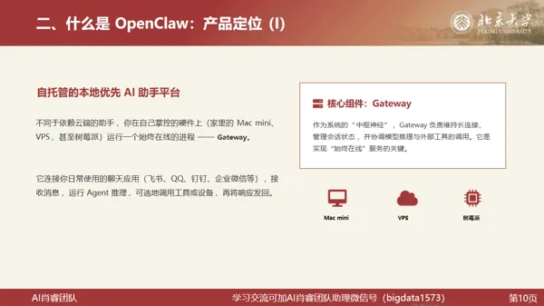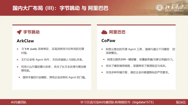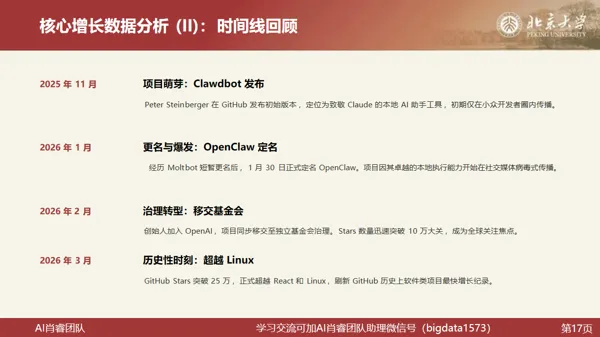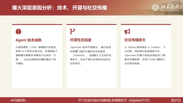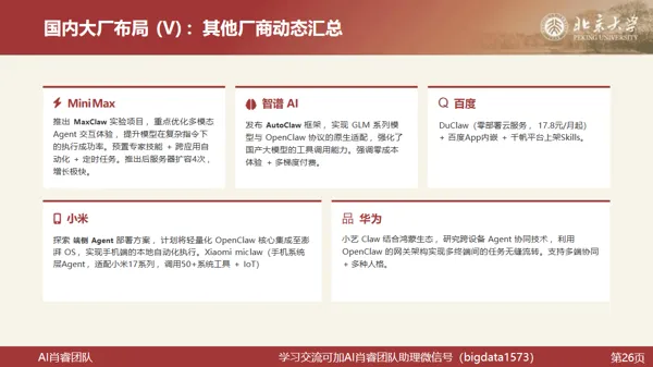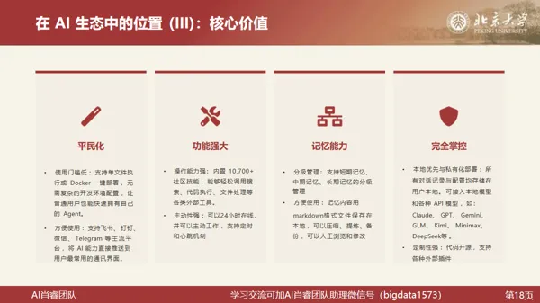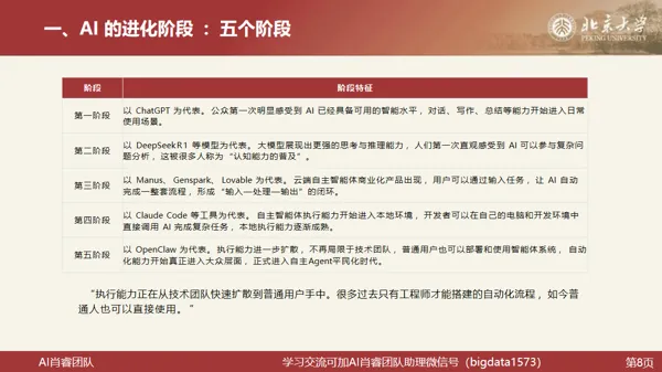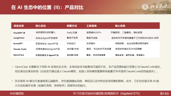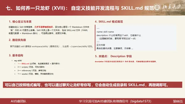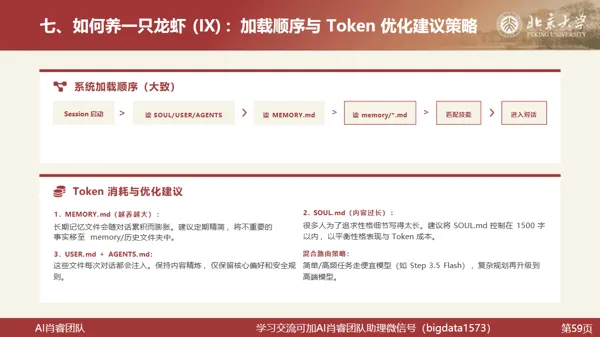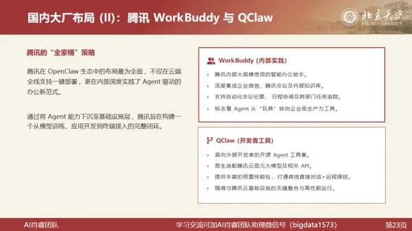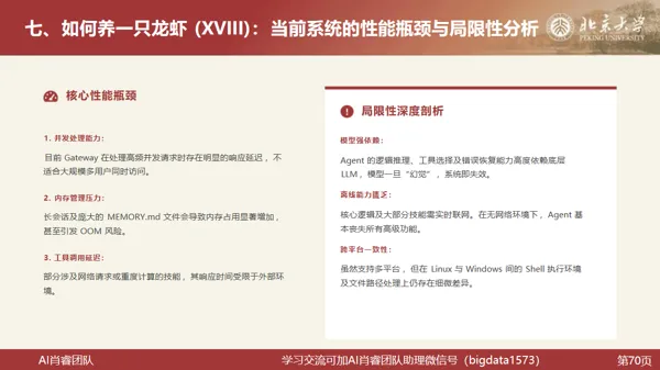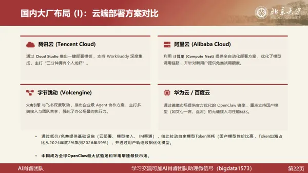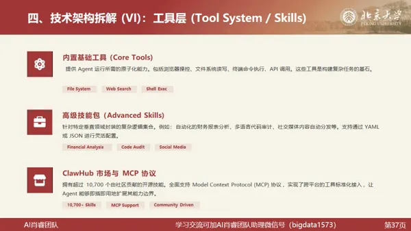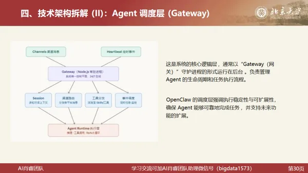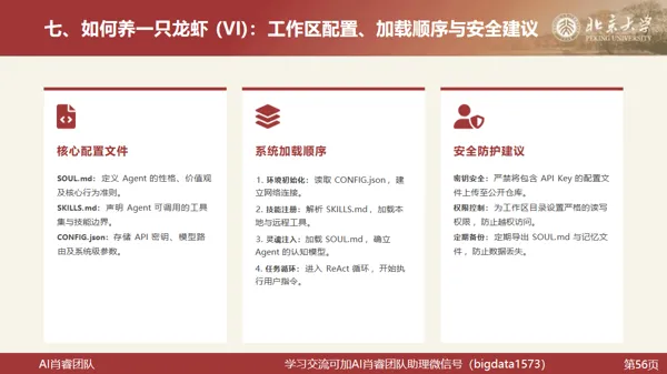 OpenClaw小龙虾使用入门手册最近出来了一款人工智能体:小龙虾比较火,不知道大家去关注了没有?其实本人作为公司的创始人和投资人,其实我只关心小龙虾的2个点:小龙虾圈钱的商务模式其实很简单:投流宣传->直播圈粉->下载小龙虾安装套件(比如:Visual Studio)->小龙虾接管应用->付费收钱->圈粉杀猪。团队版Multi-OpenClaw 或者Collaboration Platform->框架代码下载->提供开源接口协议->提供二次开发->后期付费token上述2个点很明确,还是以圈钱和赚钱为目的。用户群里不光是企业用户,包括普通用户和部分开发者用户。上述问题说明什么?说明了人工智能时代已经在一步一步从传统的科研模式,走向了商务盈利链模式,已经在建立自己的生态。直到特别是2025年年初随着人工智能的普及,传统的数据数据治理、数据资产管理平台逐步发展为:基于知识图谱+大模型架构设计的AI人工智能体平台。首先在发此文章之前,我是很不愿意的。因为这里面会透露了很多人赚钱的蛋糕秘密。但是随着2025年后,人工智能的大力普及和发展,每个中国人都必须应该学习和理解的人工智能知识,这是读者的学习知识的权利,我没权利去制止和剥夺,因为我尊重每个主动学习的人,主动学习的人永远是值得尊重的,用中国传统的古话就是活到老、学到老!谈起人工智能体、大模型应用这块知识,这2年来炒的非常火。例如: Ai办公、Ai写文档、Ai协助写代码、甚至Ai解析非结构化异构数据,Ai进行数据治理等等。其实这些基础性的Ai功能是远远不够的,大模型的核心应用点我个人理解为就是:让机械读懂我们的语言、然后让机械产生训练思维、让机械应用服务于我们人类。从图灵测试到2025年,前3年其实人工智能还处于预热阶段,真正大模型型应用起来的还是2025年年初DeepSeek的火爆发布。说回正题,由于国家目前大环境不好,随着国有资本不外流。今年做传统的数字化转型的公司基本上已经死了,我朋友的公司今年年初直接把研发线全部砍掉(仅留了几个核心开发)目前靠人际关系拿订单勉强存活。然而真正的活下来的部分民营企业,就是做大模型和人工智能这块的公司。未来20年,人工智能和高技术企业是不会死的,传统的数字化企业必然被大环境吞噬替代。说明未来行情的发展,人工智能和大模型才能够得到更好的投资人青睐。那人工智能创业怎么做呢?我目前了解到市场的情况是:很多公司都是基于开源的大模型组件做二次开发,做了一些轻量级、小规模的大模型应用产品。比如什么:Ai协助办公、Ai协助数据治理、Ai进行数据解析、文本知识抽取分析等。其实这块只是人工智能产品的初级应用仅完成部分人们日常生活中的一些基础性工作辅助功能。其实真的核心产品还是没有做到位。真正的基于数据治理的人工智能产品应该就是人工智能体的研发。包括:知识图谱的构建、大模型应用场景的分析、具体的行业实际使用的应用模型、底层的人机交互产品设计。其根本还是基于数据治理。总结:那说到底,数据是根基,怎样用人工智能AI技术服务于数据治理?今天给大家分享的是北京大学研究院于2026年3月首发的一份《OpenClaw小龙虾使用入门手册》,(这份材料非常详实,81页高保真可编辑PPT版本)文章对人工智能体的建设全面的总结和分析,从Ai的市场洞察分析、市场规模分析、人工智能体小龙虾产品架构设计、项目实施案例、应用市场等几个方面进行剖析和总结。非常具有参考意义和行业指导作用,欢迎大家认真研读学习,转发分享。此文章PPT来源于某圈内好友业内对外培训材料,版权归北京大学研究院团队原作者所有。珂珂进行深度解读,大家一起学习进步,欢迎转载分享。