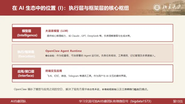 北京大学肖睿团队刚刚发布了一份81页的系统性讲座文档,题为《OpenClaw001:龙虾使用入门——技术架构、生态、应用场景》。报告面向没有技术背景的老师、职场人、创业者和企业管理者,是目前国内最完整、最易读的 OpenClaw 入门解析。