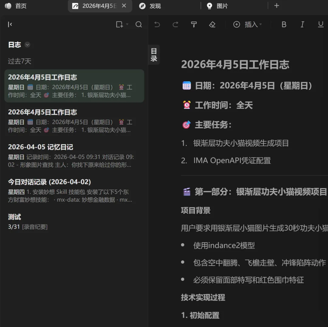 简单说:OPENCLAW 是你的智能爪子,IMA 是让这爪子变得更灵巧的大脑。而且OPENCLAW+IMA打通了你的电脑、手机、OPENCLAW之间信息传递和文件传递的桥梁。大家一定遇到过,你用手机聊天工具指挥云端OPENCLAW干活后,生成的文件不一定方便在聊天工具中直接取得,如果让OPENCLAW把生成的文档直接放IMA笔记中,手机就能很方便查看和处理了。另外还有个比较实用的,可以每天定时让OPENCLAW把当天的所有对话记录保存在IMA笔记中,也很方便后续分析归档和管理。