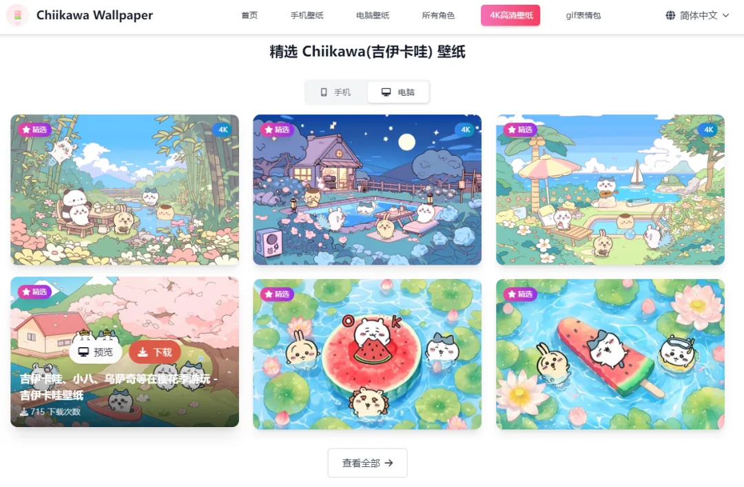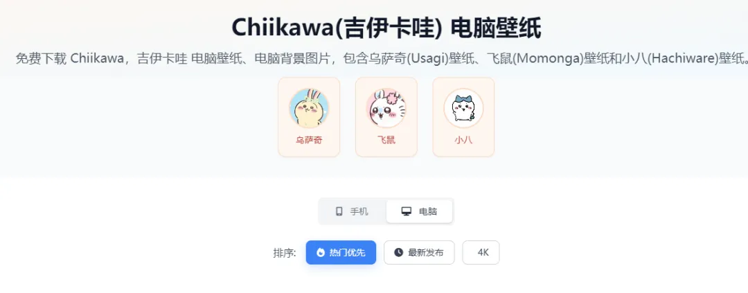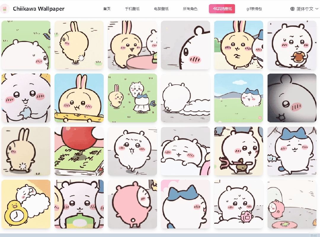 一个可以免费下载Chiikawa(吉伊卡哇)壁纸、吉伊卡哇gif的网站,包含吉伊卡哇、乌萨奇、飞鼠、小八等角色,太可爱了!不知道《吉伊卡哇(Chiikawa)》这不漫画你看过没,里面的角色都非常可爱。今天分享的这个网站可以让你免费下载Chiikawa(吉伊卡哇)桌面、吉伊卡哇gif、吉伊卡哇png,主要包含吉伊卡哇、乌萨奇、飞鼠、小八等角色。这个网站界面简单,上方导航区域,包括:手机壁纸、电脑壁纸、gif表情包等。右上角可以切换语言。根据导航区域分类,你可以选择手机壁纸、电脑壁纸,也可以根据角色来选择壁纸。选择好喜欢的壁纸后,可以选择预览或者直接下载即可。下载的都是4K原图,清晰度很高。另外,你可以选择gif表情包,一个一个的也很可爱,点击预览就可以下载。这个电脑桌面和手机壁纸都很可爱,打开网址就能下载哦,以下是我下载的几张,大家欣赏下。你感觉这个网站怎么样?快复制下面的网址,去电脑上操作吧。网站名称:Chiikawa Wallpaper
