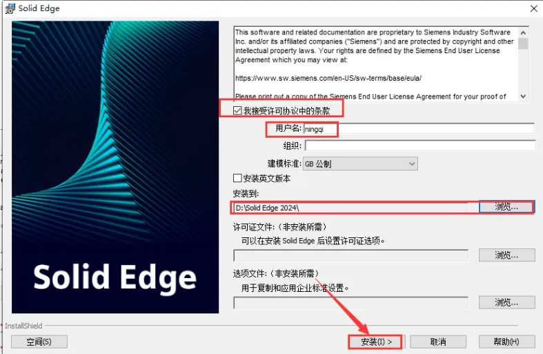 4. 软件许可协议接受及更改安装位置:首先勾选软件许可协议接受,接着输入用户名(随意输入),然后更改安装位置(更改安装位置不能带有中文或特殊符号),最后点击【安装】。
