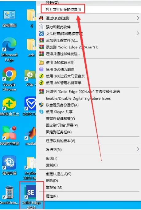 8. 在电脑桌面找到【Solid Edge 2024】软件,鼠标右键打开文件所在的位置进入安装目录位置。
