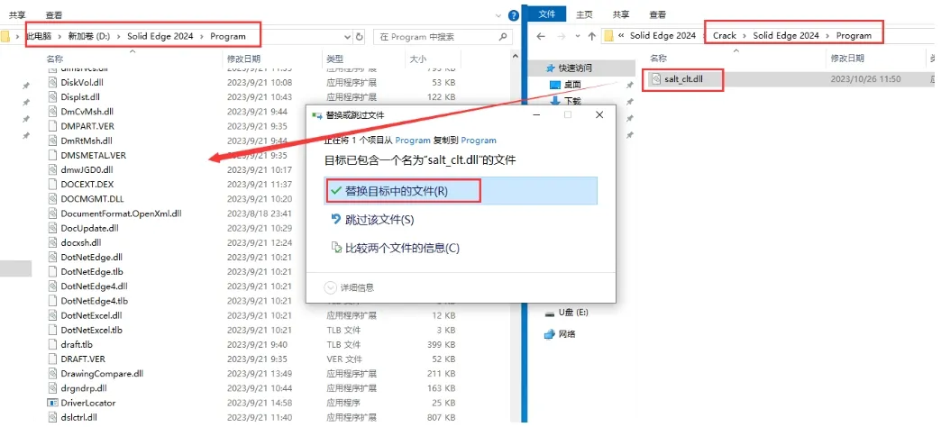 9. 将安装包【Crack\Solid Edge 2024\Program】里面的破解补丁【salt_clt.dll】复制到刚才打开的软件安装目录位置下替换。