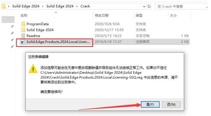 11. 双击运行【Solid.Edge.Products.2024.Local.Licensing-SSQ.reg】,弹出对话框,点击【是】。