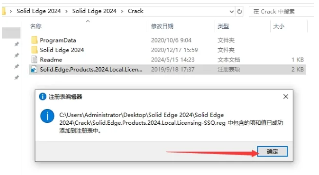 12. 【Solid.Edge.Products.2024.Local.Licensing-SSQ.reg】成功添加到注册表中,点击【确定】。