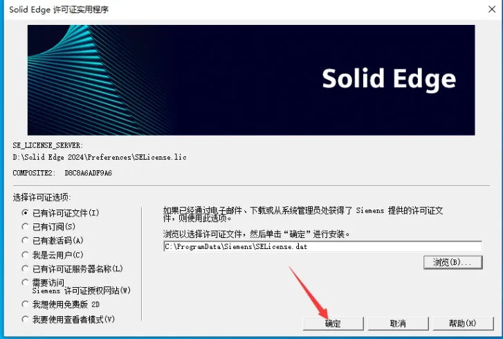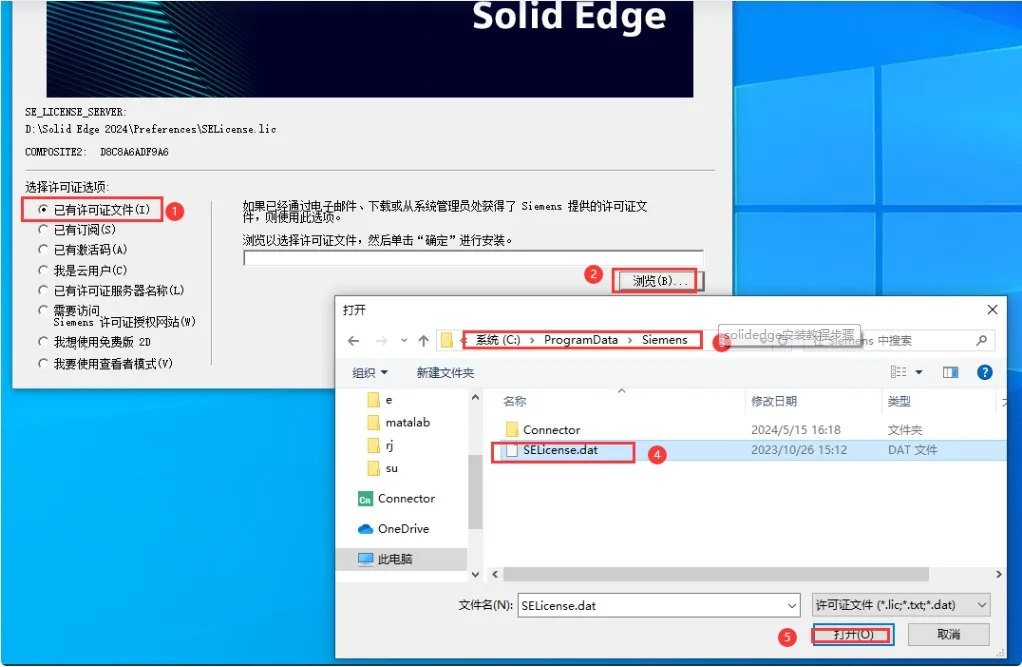 13. 打开电脑桌面的【Solid Edge 2024】软件,进入界面。①选择【已有许可证文件】②点击【浏览】③找到【ProgramData\Siemens】文件夹下的【SELicense.dat】打开。