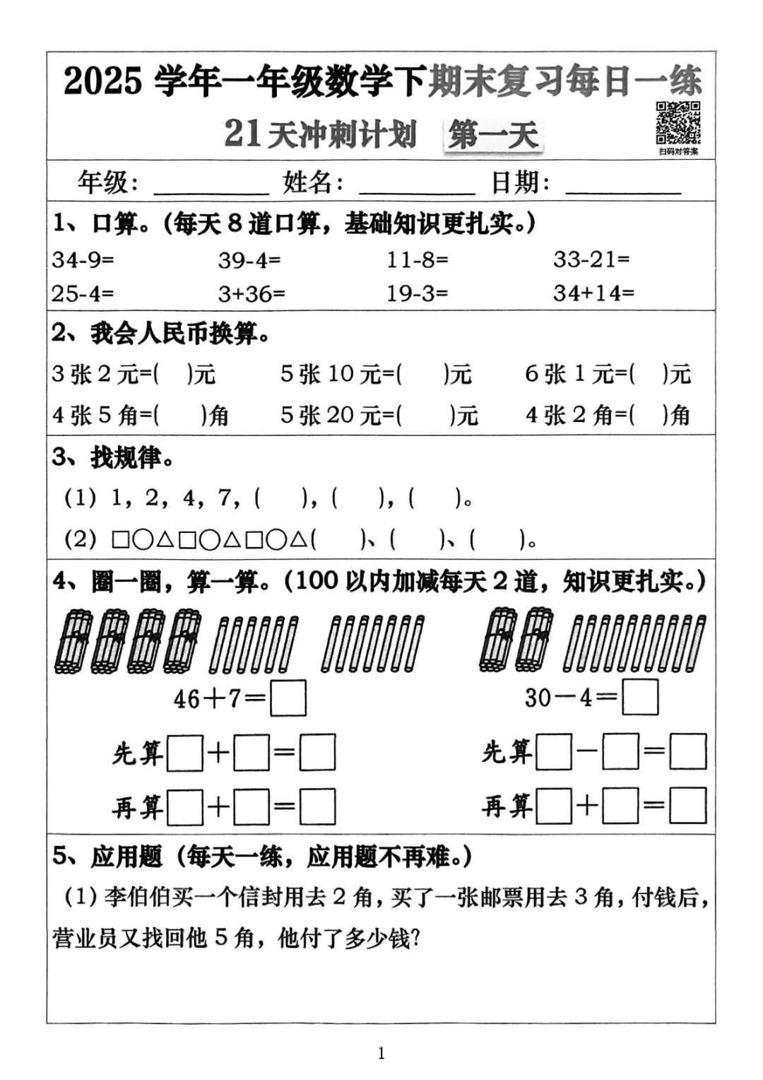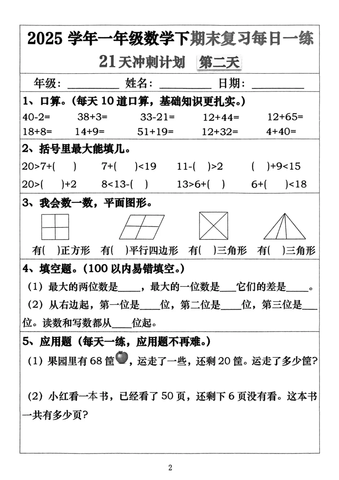 【免费下载】一年级数学下册期末复习冲刺21天计划每日一练,PDF电子版,共21页,先保存,以免资源失效
