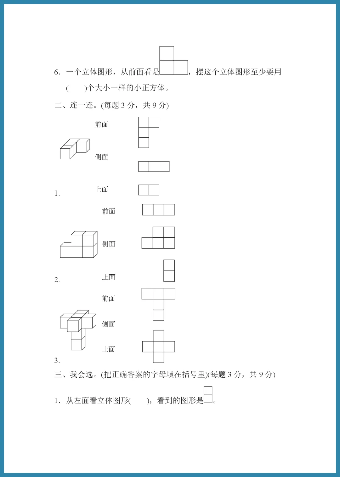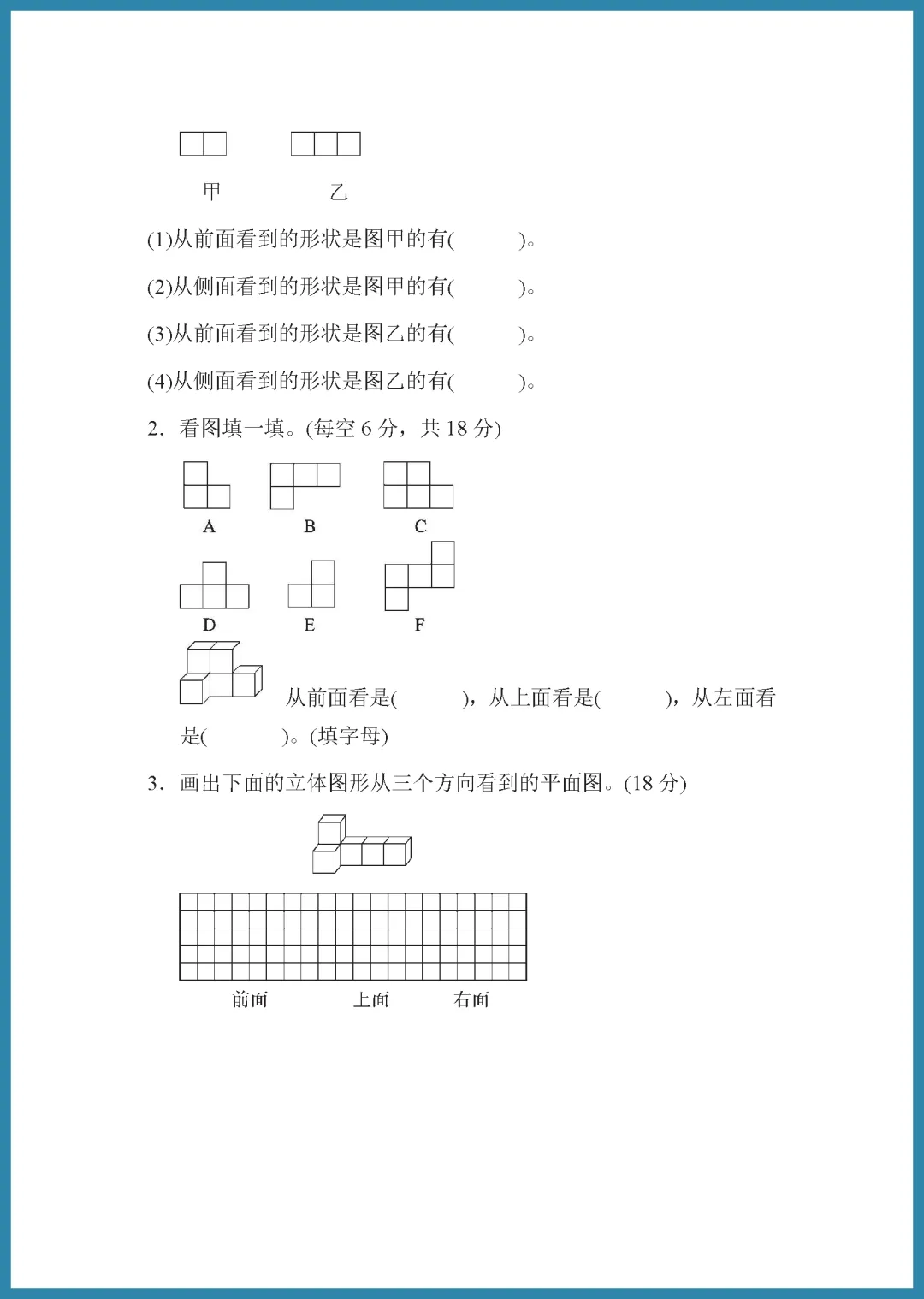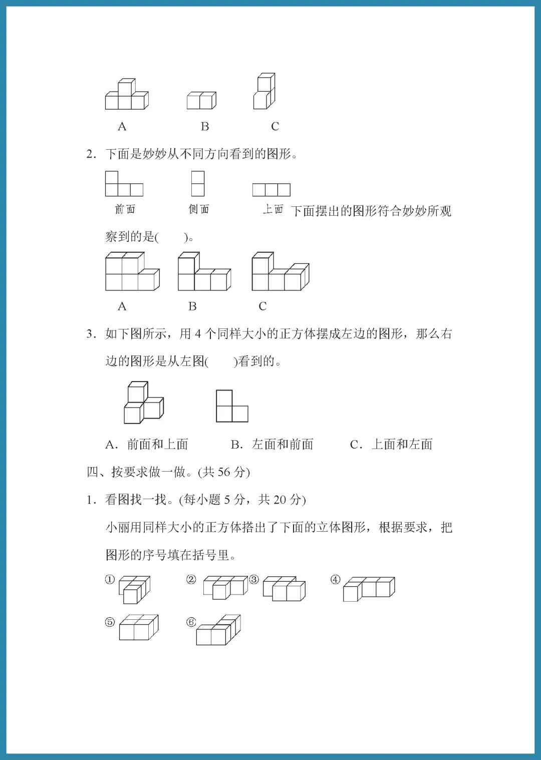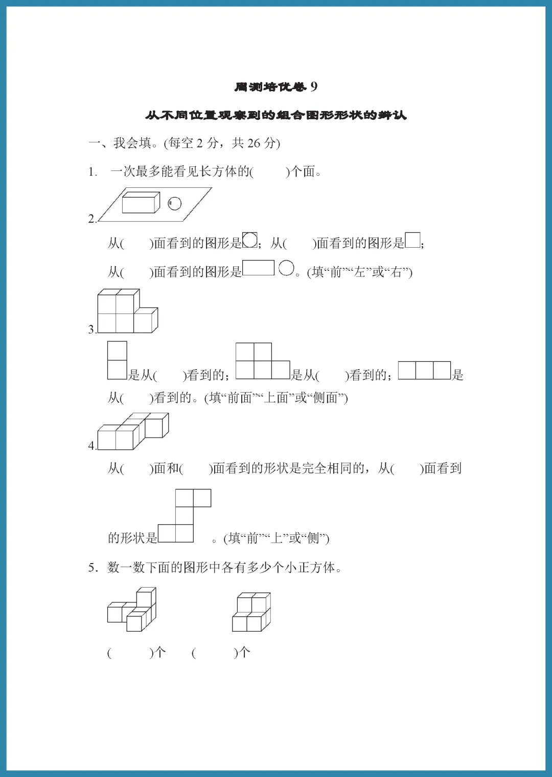 青岛版六年级三学制四年级下册数学家长请注意!这份 2024 年周测培优卷第 9 套,专为“从不同位置观察组合图形”难点打造,共 5 页精选题目。试卷紧扣教材,通过多角度视图辨析,帮助孩子突破空间想象瓶颈,轻松掌握立体图形观察技巧,考试不再丢分。题目由浅入深,既能巩固基础又能提升思维,是居家查漏补缺的绝佳素材。需要的家长抓紧打印给孩子练一练吧,让孩子在练习中建立自信,数学成绩稳步提升!