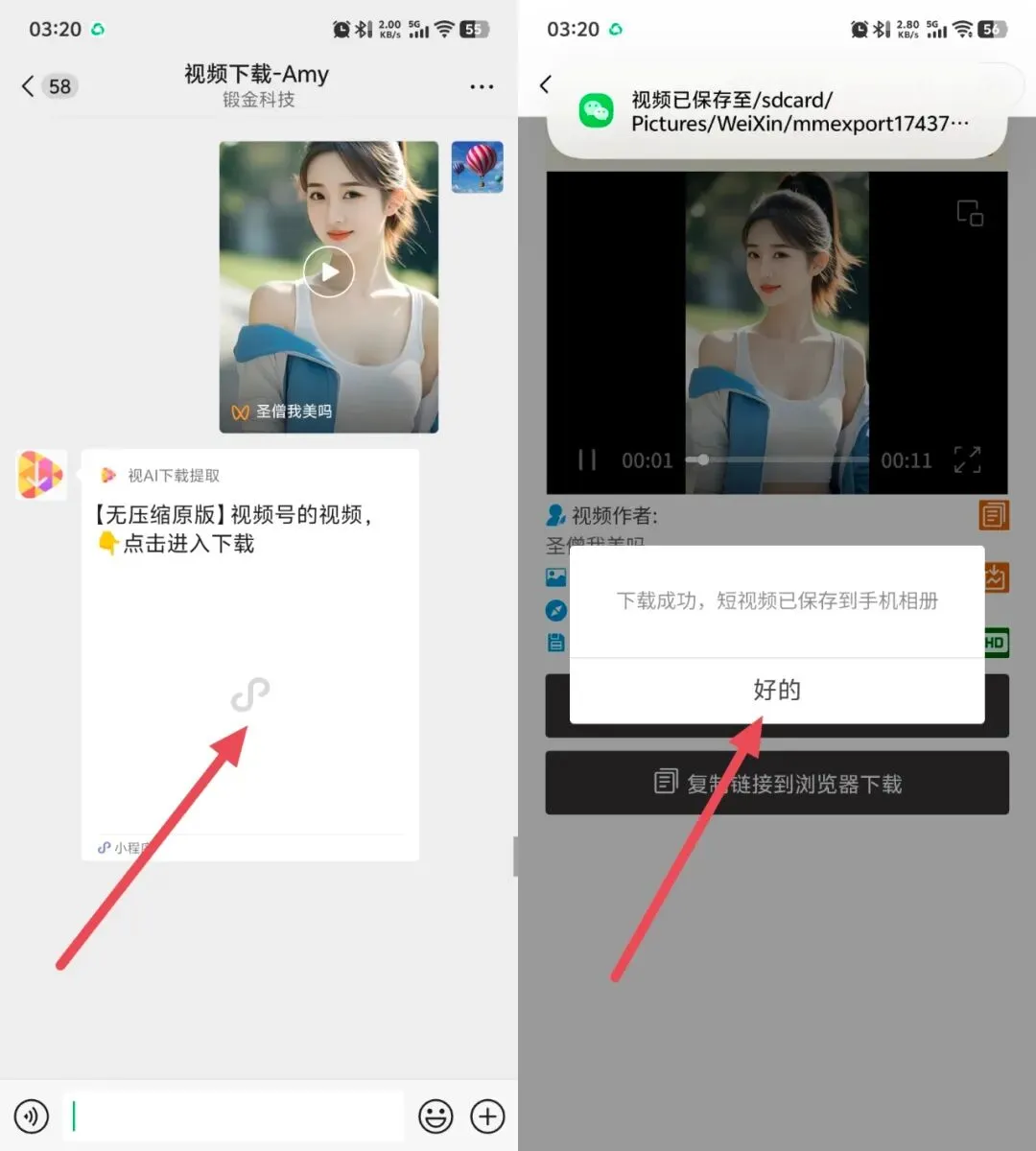 2️⃣.2️⃣ → 「视频下载客服机器人」将自动解析,并秒速返回一个下载小程序链接;点击进入小程序,即可一键下载到手机相册,轻松完成视频号视频下载提取!