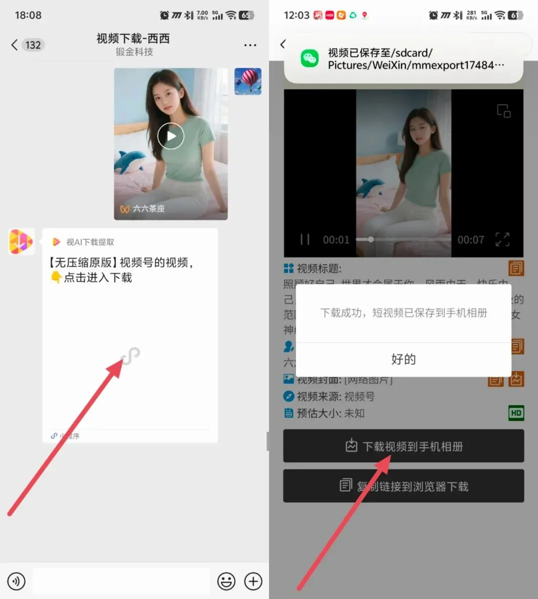 3️⃣ 自动解析返回下载小程序 → 进入小程序,一键下载到手机相册眨眼间,高清视频乖乖躺在你的手机相册里!告别各种复杂的视频下载工具,享受如何下载视频号里的视频带来的便捷与高效!