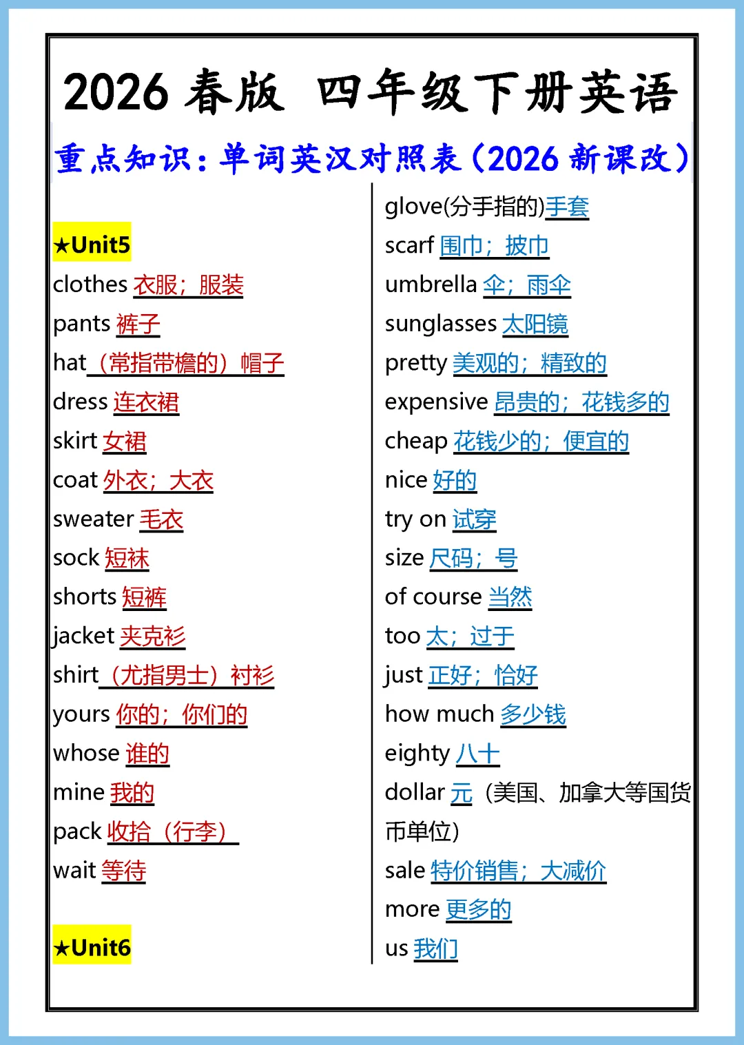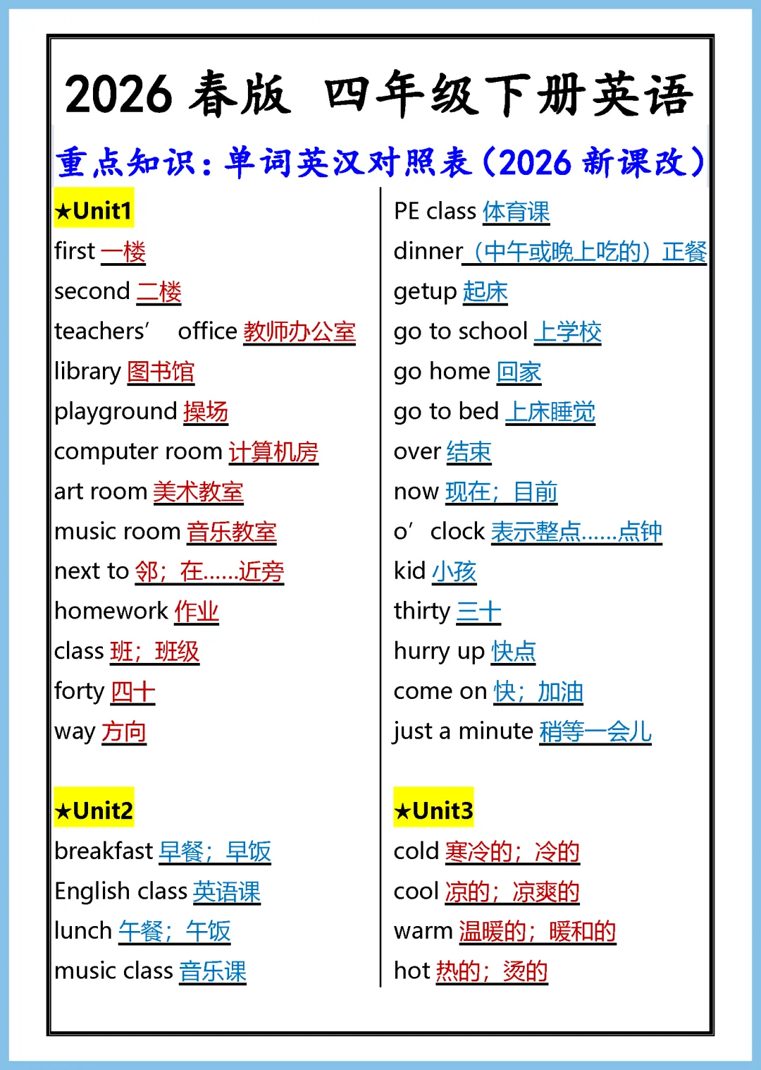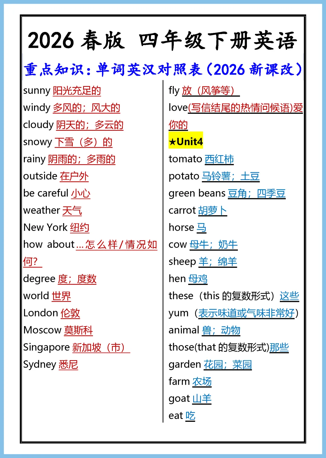 各位家长注意啦!2026 春新版四年级下册英语重点知识来啦,这是人教版 PEP 专用的单词英汉对照表,整整 3 页精华内容。资料涵盖了本学期所有核心词汇,中英对应清晰明了,能帮孩子快速攻克背词难关,夯实基础,轻松应对日常测验。单词是英语学习的基石,掌握好了成绩自然稳步提升。这么实用的备考神器,需要的家长抓紧打印给孩子练一练吧,让孩子新学期自信满满迎头赶上!