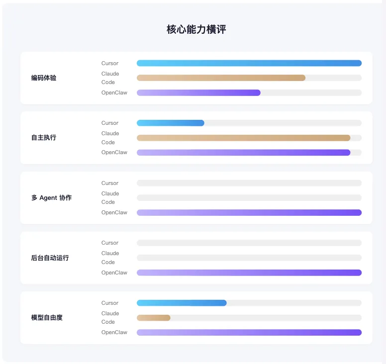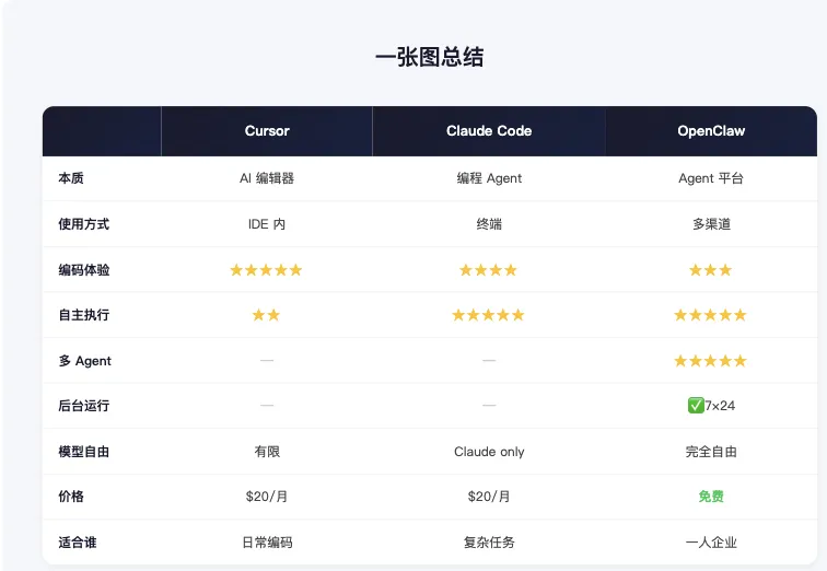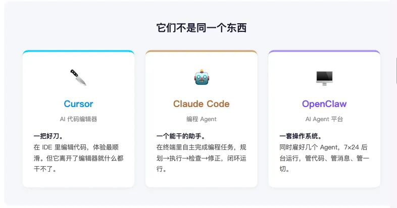 这就是三者的本质区别:Cursor 是一把好刀,Claude Code 是一个能干的助手,OpenClaw 是一个能同时雇好几个助手的系统。