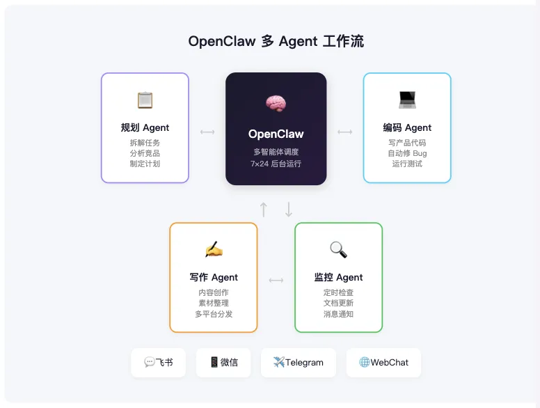 原因很简单:你不只是写代码。你要规划项目、搜索竞品、写文章、发布内容、回复消息、监控数据。这些事情 OpenClaw 的多 Agent 架构都能干。