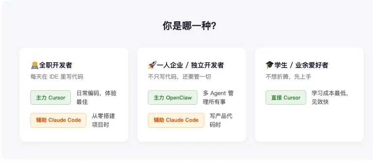 想找个好用的 AI 编辑器,日常写代码 → Cursor 想让 AI 在终端里帮你自主完成编程任务 → Claude Code 想搞一人企业,用 AI 管理你所有事 → OpenClaw