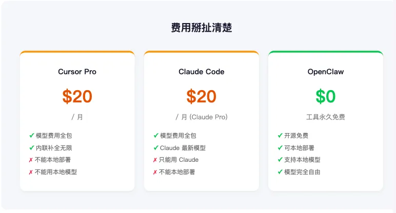 我的策略:OpenClaw(免费)+ Claude Pro($20/月,给 Claude Code 用)。Cursor 的 Pro 我暂时没续,因为大部分编码任务用 Claude Code 就够了。